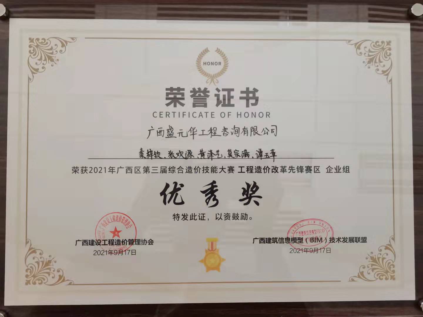 2021年廣西區(qū)第三屆綜合造價技能大賽(以下簡稱“大賽”)的系列比賽已全部結束,在9月17日的頒獎典禮上,公司參賽團隊以優(yōu)異的成績在本屆技能大賽中再次收獲榮譽:榮獲工程造價改革先鋒賽區(qū)個人組第一名和企業(yè)組優(yōu)秀獎、企業(yè)數字化開拓者賽區(qū)企業(yè)組三等獎。