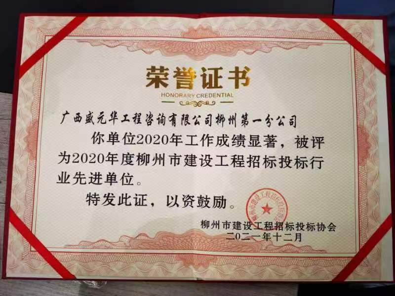 | 喜訊!熱烈祝賀廣西盛元華集團旗下柳州一分公司榮獲2020年度"柳州市建設(shè)工程招標代理行業(yè)先進單位"的榮譽稱號 |